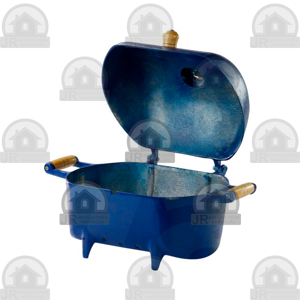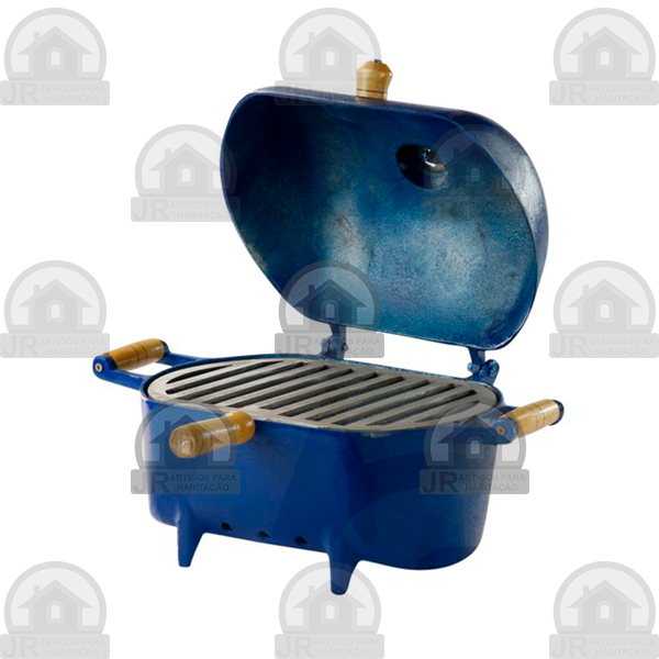 Churrasqueira em alumínio fundido com acabamento em pintura eletrostática craqueada azul.