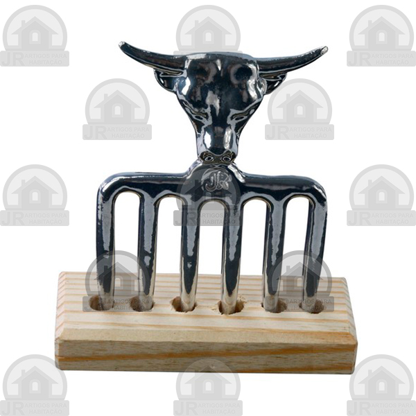 Cód: 0039 Garfo Touro 6 dente feito em alumínio fundido com acabamento cromado. Possui 15cm de altura aproximadamente. Contém: 1 garfo touro 6 dente 1 base madeira