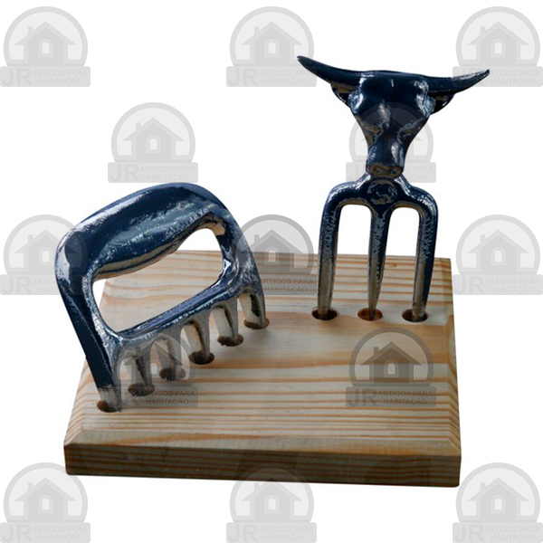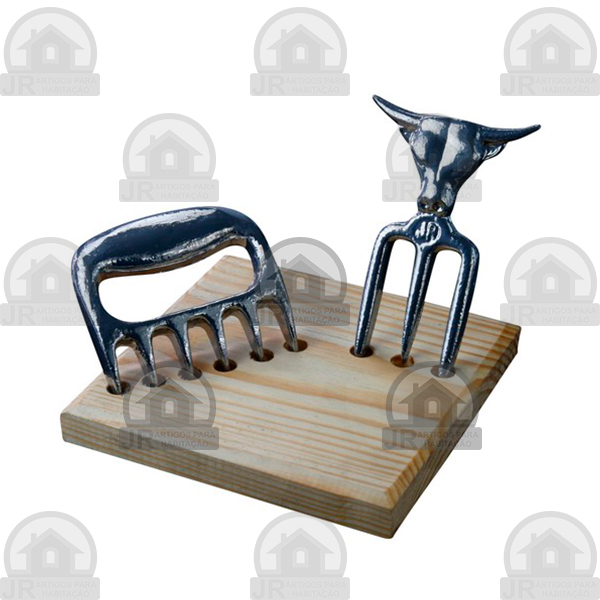 Cód: 0030 Kit churrasco todo em alumínio com o acabamento em pintura eletrostática cromada com base em madeira. Medidas: Garra de urso e tridente 15 cm de altura aproximadamente.